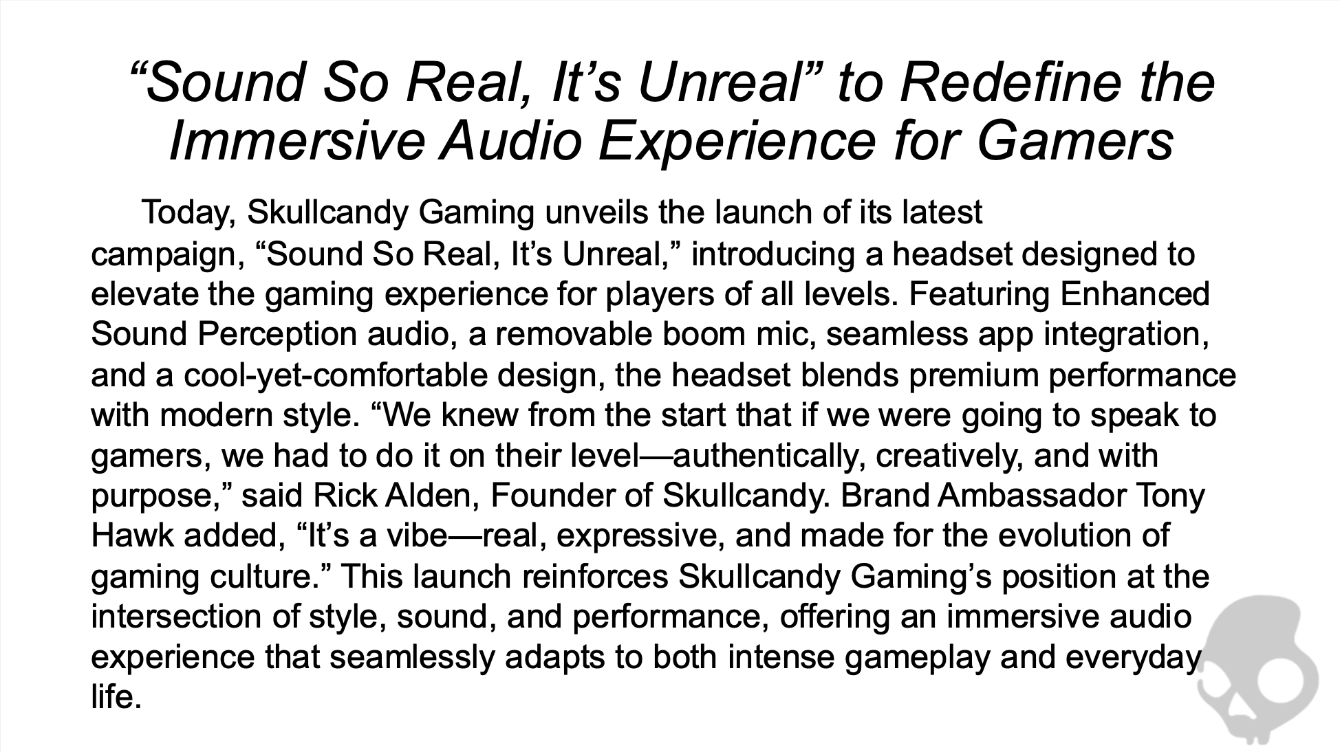 At the heart of this campaign is more than just sound—it’s the power to immerse, excite, and elevate the gaming experience. Skullcandy Gaming is ready to make it real… so real, it’s unreal. Let’s dominate online, own retail, and take Skullcandy Gaming to the top. Thank you.